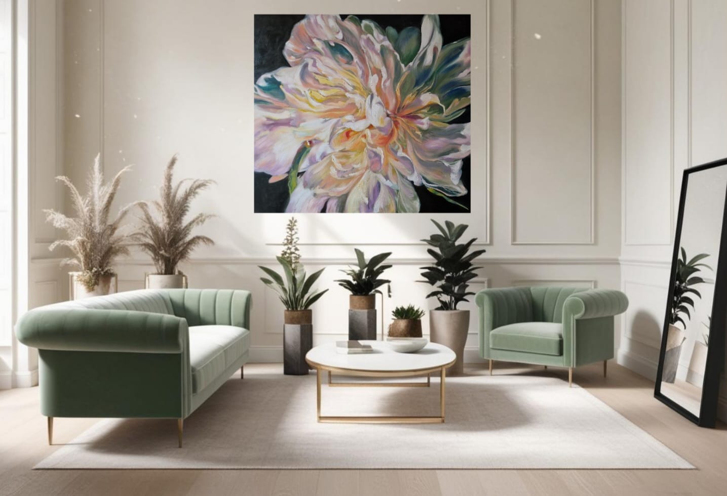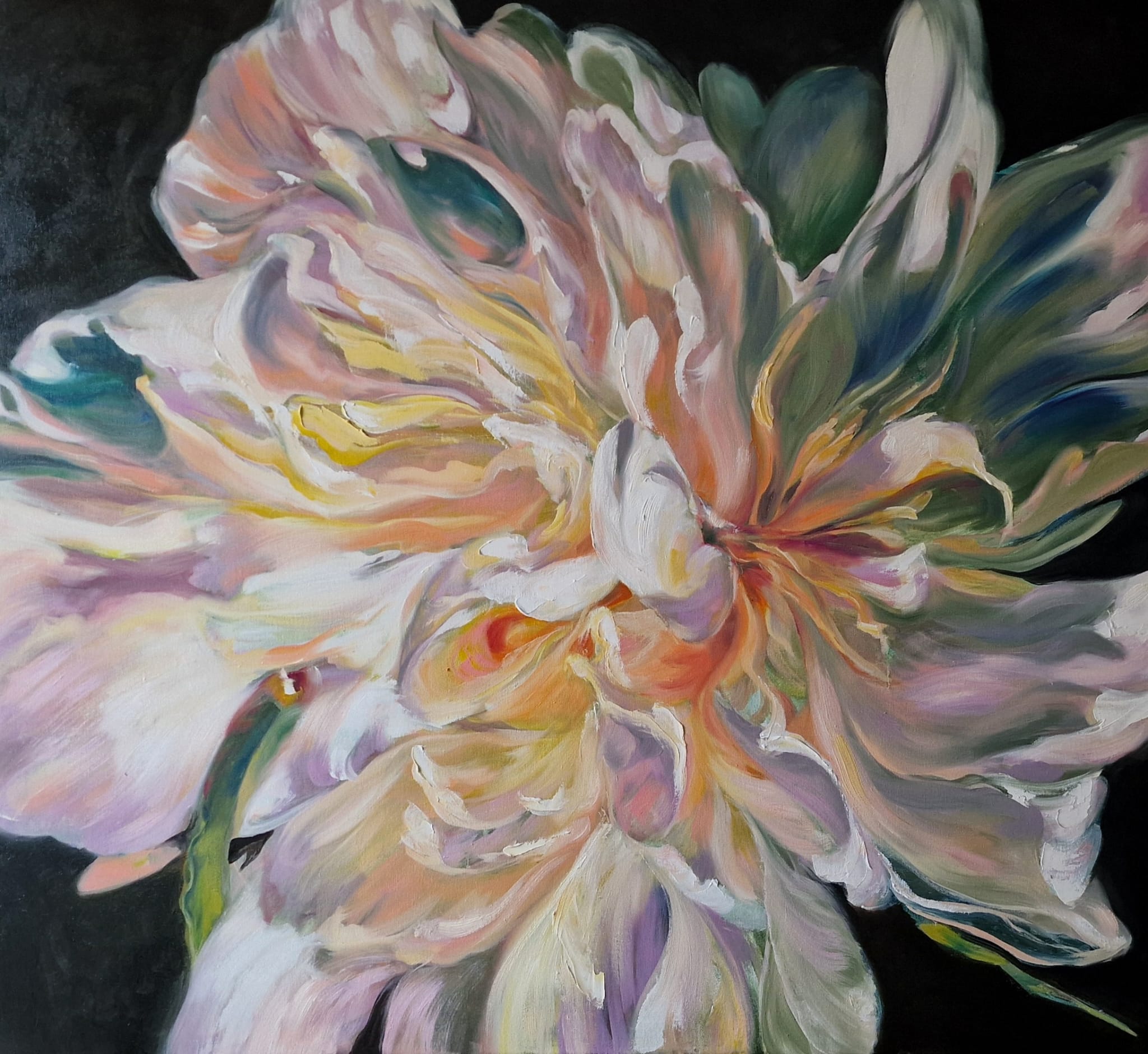 Pictura florala contemporana in nuante de alb, roz si verde.